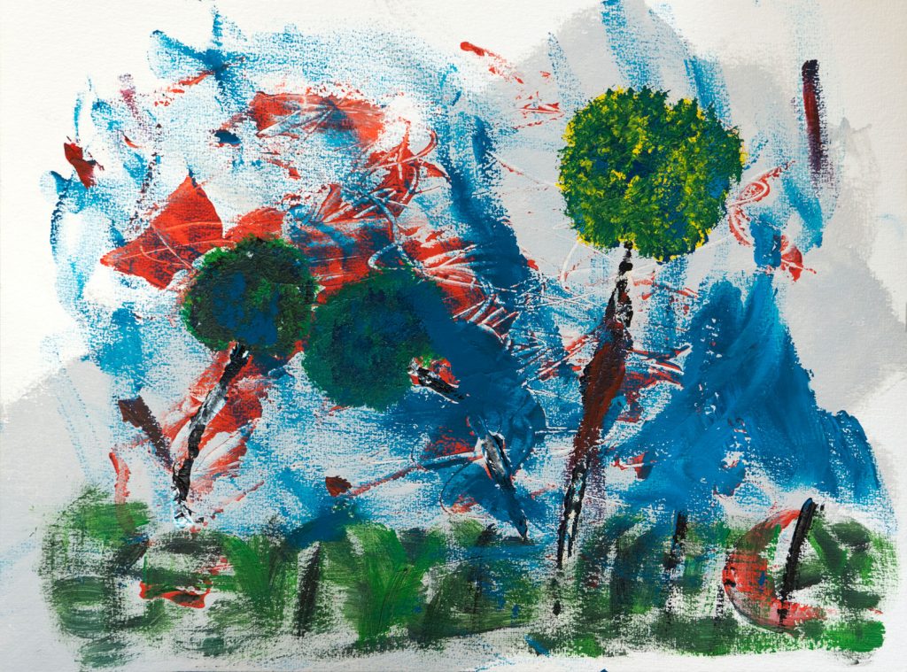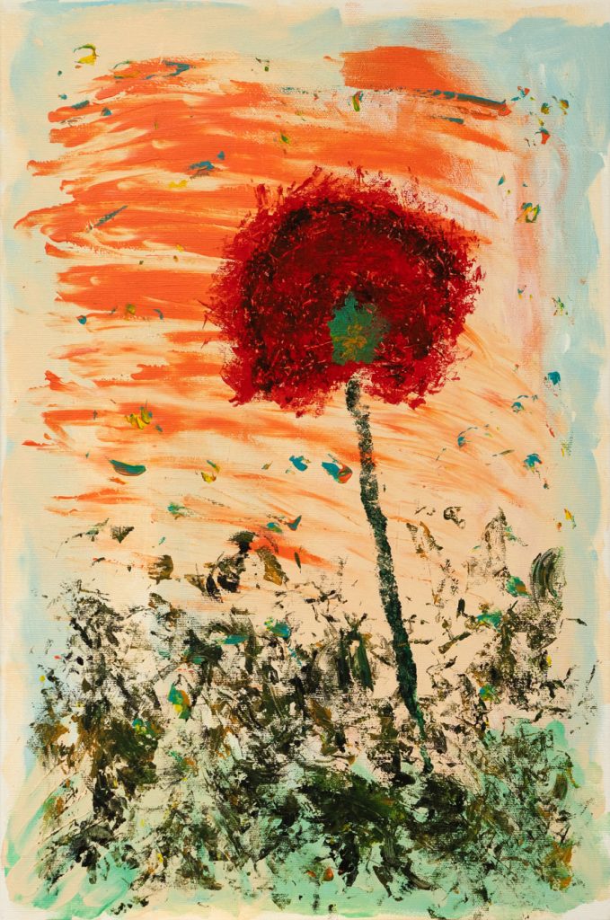 »Während seine Lieder Geschichten erzählen, gingen schon die ersten Bilder in eine andere Richtung, waren mehr oder weniger abstrakt. Gern bezieht er bis heute den Zufall mit ein. Etwa an dem Tag, als er mithilfe einer Flasche Rotwein seine Farbpalette entscheidend erweitern konnte.«